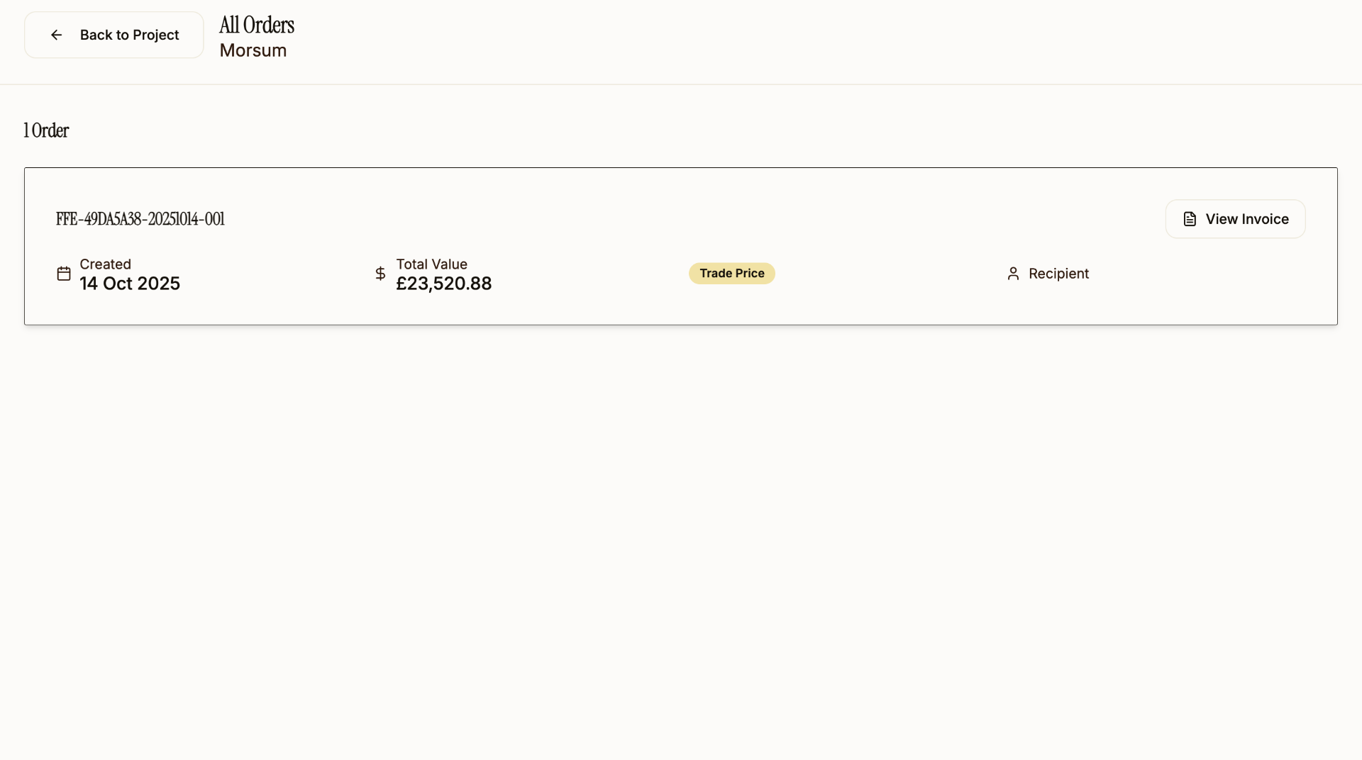 Invoice generation. Create professional invoices for clients with one click. No separate accounting software needed for FF&E procurement projects.