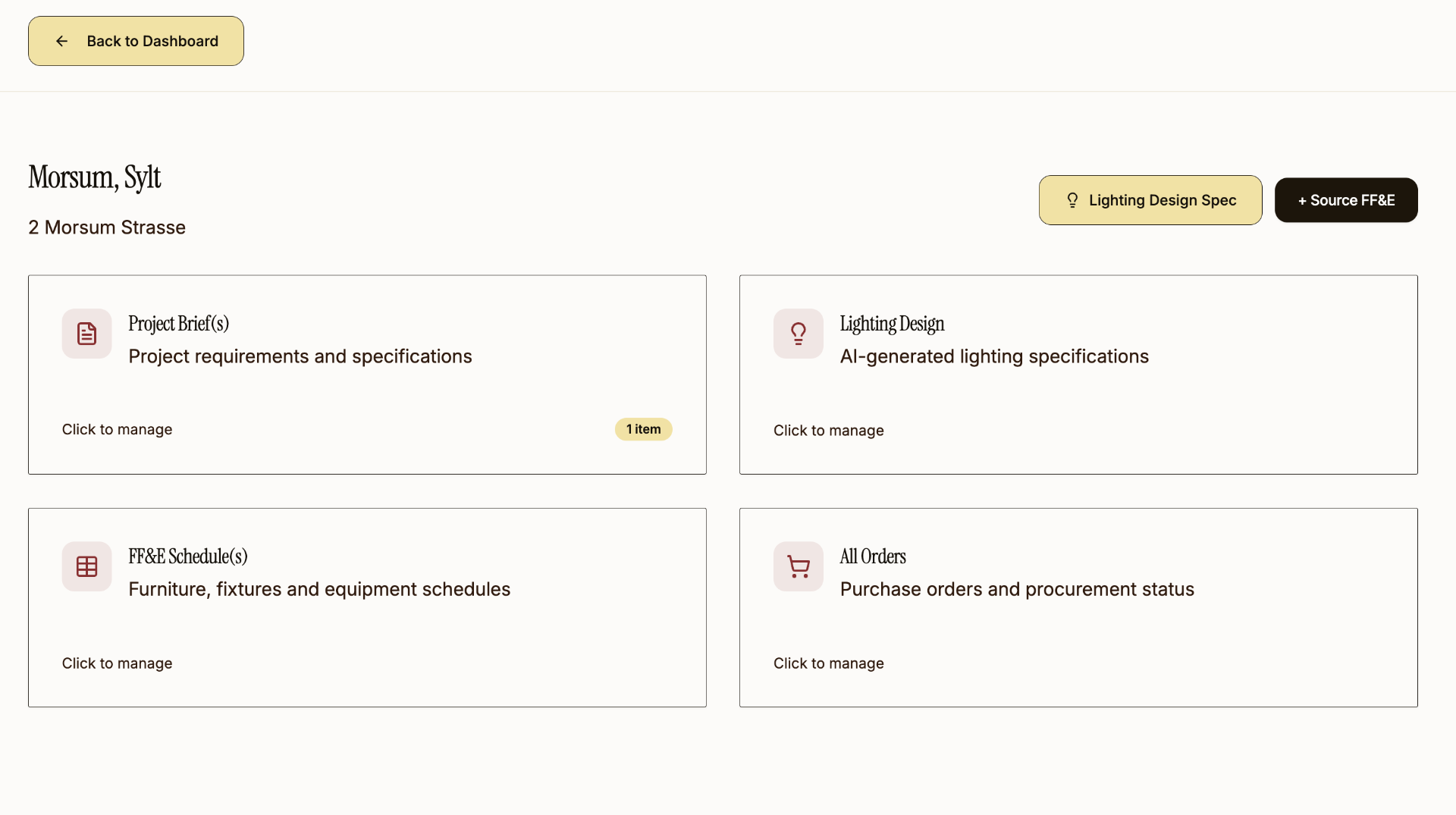 Everything in context. Notes, tasks, and plans are linked to the relevant project and FF&E items. No scattered information across apps.